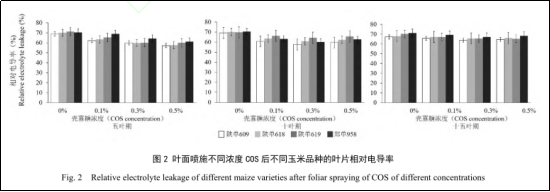 2. 三個葉齡葉面噴施殼寡糖第二天測定的葉片電導率和丙二醛含量,均較清水對照降低。試驗表明,殼寡糖葉面噴施對細胞膜具有保護作用。