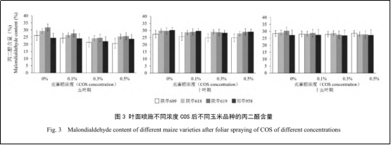 研究人員將殼寡糖稀釋成0.1%、0.3%、0.5%的不同濃度后,在五葉期、十葉期和十五葉期分 3 次葉面噴施,與清水對照組比較,研究殼寡糖對不同玉米雜交種抗旱相關生理指標、產量及其構成因素的影響。具體研究結果如下: