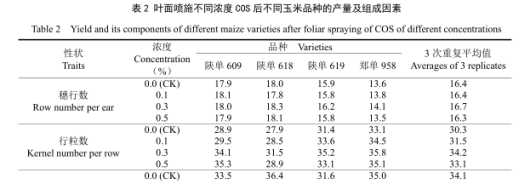綜上分析,三種殼寡糖濃度間葉片相對含水量、電導率和丙二醛含量在 5%的概率水平上差異顯著,說明殼寡糖葉面噴施可通過對細胞膜的保護作用提高玉米在干旱脅迫條件下的保水能力。但是,三種殼寡糖濃度間吐絲期、生育期、株高和穗位高差異不顯著,說明對成株期植株性狀影響較小。對穗行數(shù)、百粒重、行粒數(shù)和穗粒重的方差分析結果,僅行粒數(shù)和穗粒重差異顯著,而且以0.3%濃度的作用更為明顯。在相同的株行距下,穗粒重即代表單位面積產量。由此說明,殼寡糖噴施主要通過信號轉導,調節(jié)玉米應答干旱脅迫的生理活性,增加行粒數(shù)而提高籽粒產量。因此得出結論,在干旱脅迫下葉面噴施殼寡糖對細胞膜具有保護作用,可通過對行粒數(shù)的影響而提高玉米產量。雖然殼寡糖主要作為信號分子而起作用,但其不同濃度對玉米耐旱相關生理活性的調節(jié)效應是不同的。